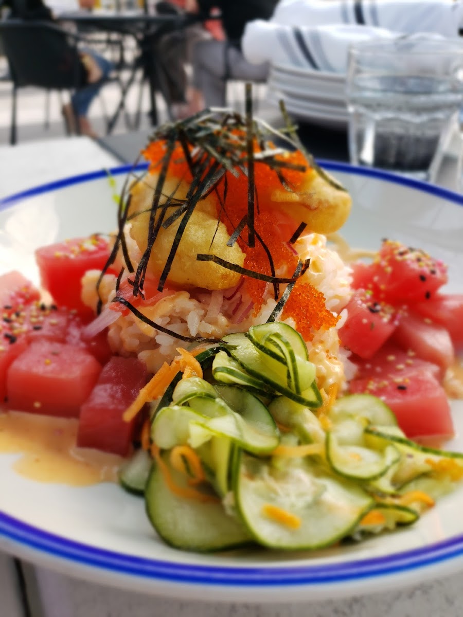 Pretty cool spot. Rooftop is spacious. Servers are welcoming and friendly. The menu has a lot of options. You can order food from Five and Dime, Taco Diablo, or Lulu's. I ordered the Tuna Poke Bowl. It was huge! Lots of food and it was good. The fish was fresh. Everything was well seasoned. It comes with a large piece of tempura shrimp, which honestly wasn't too great. Tasted like more breading than shrimp. The rest of the bowl was great though. The drinks were decent. The New Friendship was strong and well made. The Maple Old Fashioned was good, but sugary. The whole place was very clean. Restrooms were clean. Casual and chill vibe. Great spot to hang out and grab a drink and appetizers. Paid street parking available nearby. I would recommend this spot.
